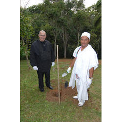 Da esq. p/ dir: Monge Jo-shin, da Comunidade Zen Budista e Tateto de Inkici Kizambeloya, da Nação Angola (Candomblé), plantando uma muda de árvore no Solo Sagrado. A atividade precedeu o abraço simbólico na represa Guarapiranga.