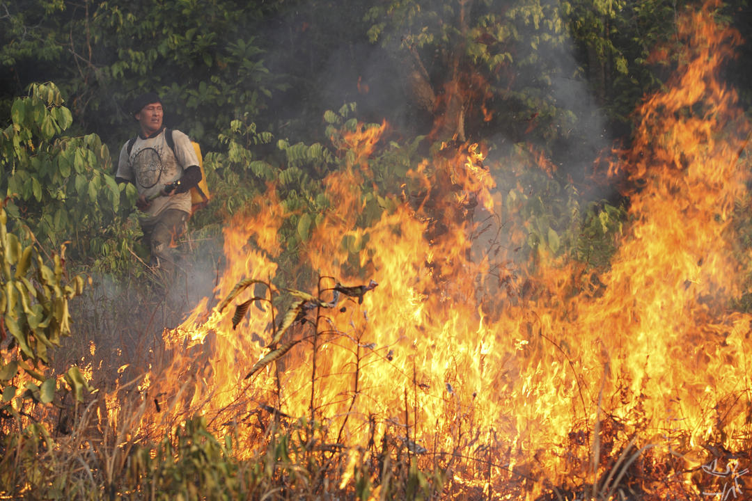 Waurá durante treinamento de brigada contra incêndios, Parque Indígena do Xingu, Mato Grosso